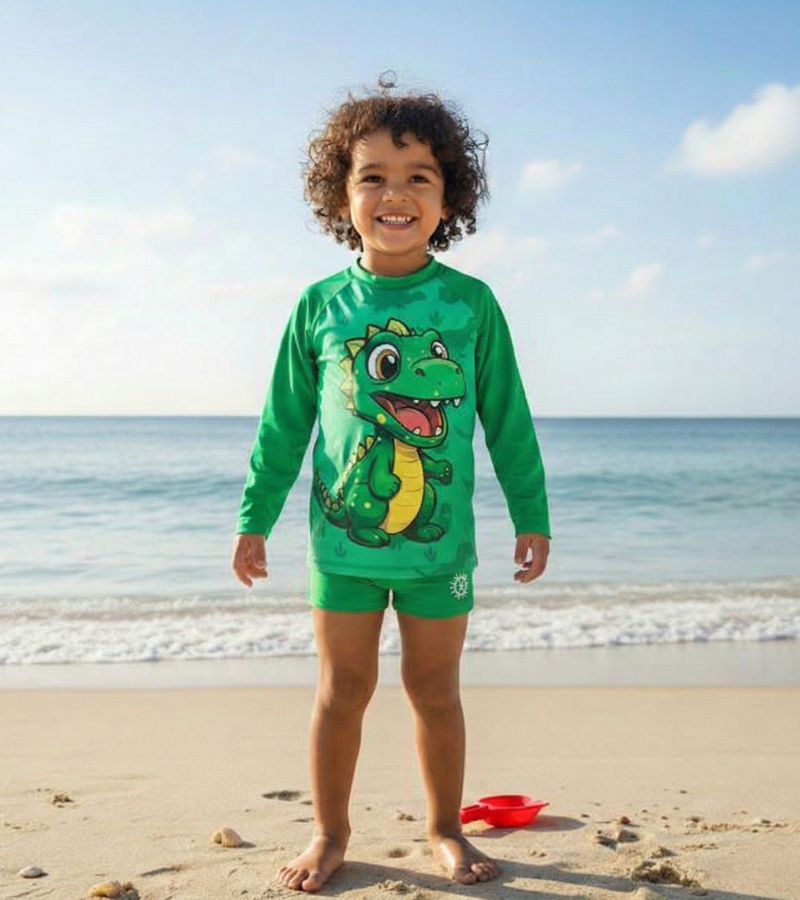 Garanta conforto, proteção e estilo para o seu pequeno com este Conjunto Infantil Dinossauro, ideal para praia, piscina e atividades ao ar livre!