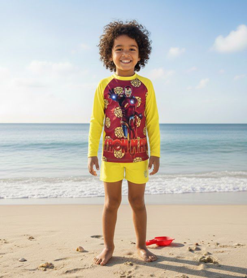 Garanta conforto, proteção e estilo para o seu pequeno com este Conjunto Infantil Homem de Ferro, ideal para praia, piscina e atividades ao ar livre!
