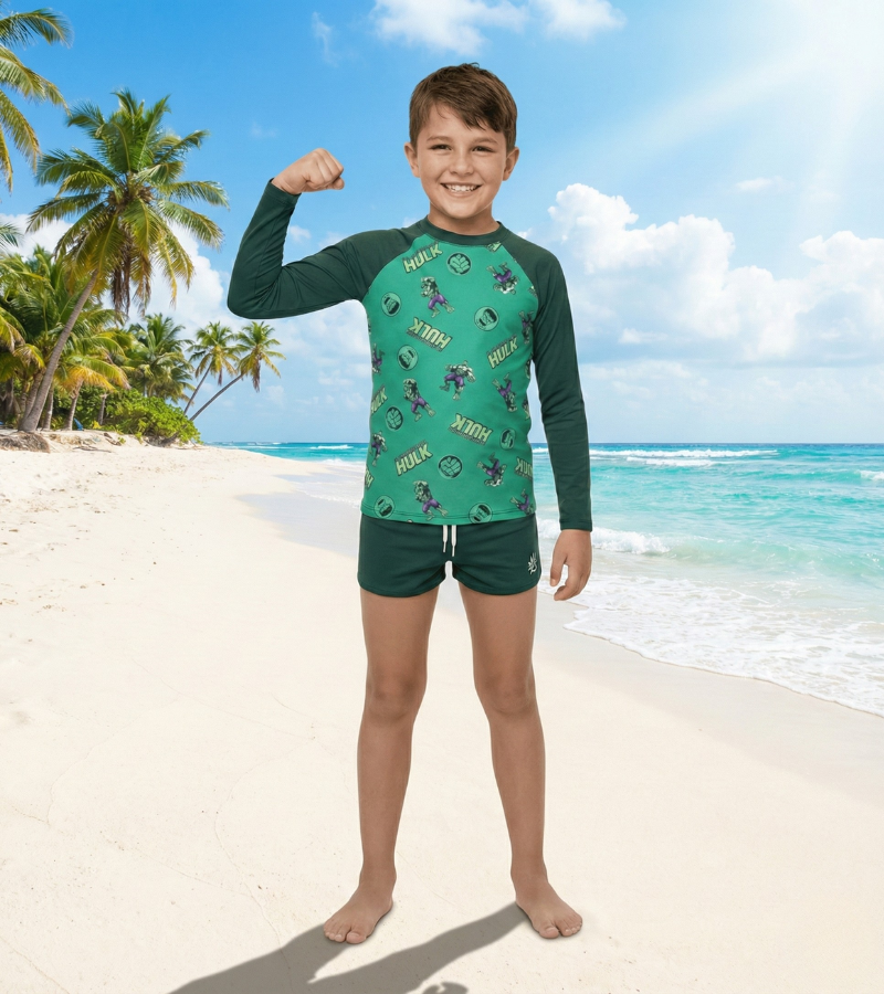 Garanta conforto, proteção e estilo para o seu pequeno com este Conjunto Infantil Hulk, ideal para praia, piscina e atividades ao ar livre!