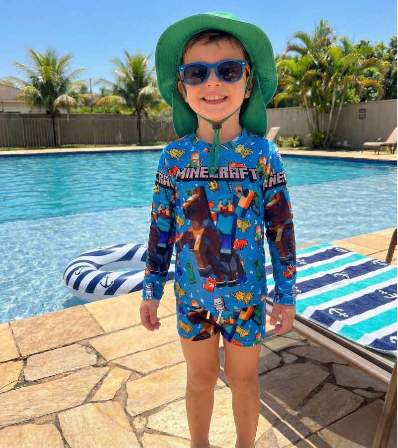 Garanta conforto, proteção e estilo para o seu pequeno com este Conjunto Infantil Minecraft, ideal para praia, piscina e atividades ao ar livre!