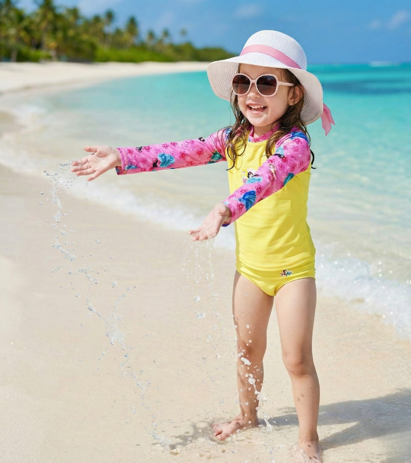 Manga longa, ideal para proteger ainda mais a pele das crianças em ambientes ensolarados.