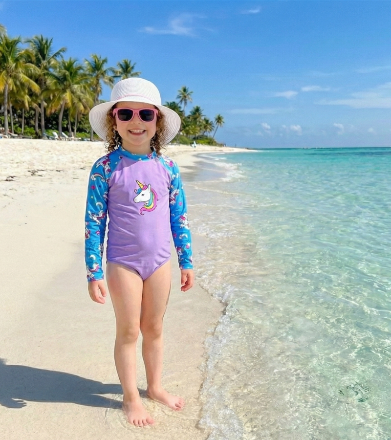 Manga longa, ideal para proteger ainda mais a pele das crianças em ambientes ensolarados.